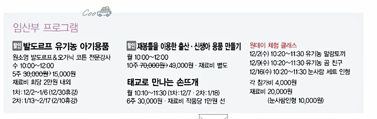 임산부 강좌 는 배냇저고리, 손싸개, 모빌 등 아기용품을 손수 만드는 강좌가 준비되어 있고, 저녁프로그램 으로는 플라워 클래스, 손뜨개, 수채화, 필라테스 요가, 보컬 트레이닝, 케이팝 댄스, 중국어, 정리수납, 줌바댄스, 통기타 교실 등이 있습니다.
