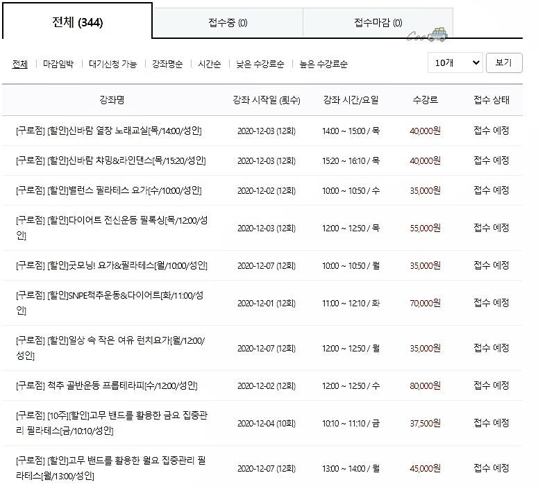 현재는 접수 상태가 접수 예정으로 되어있으나 접수가 시작되면 '접수가능' 이 뜨게 됩니다. 홈페이지에서 로그인 후 원하는 강좌 옆에 활성화 된 '접수가능' 버튼을 눌러 수강 신청을 합니다. 강좌를 2개 같이 신청하는 경우 장바구니에 담아서 한 번에 결제 하시면 되겠습니다.