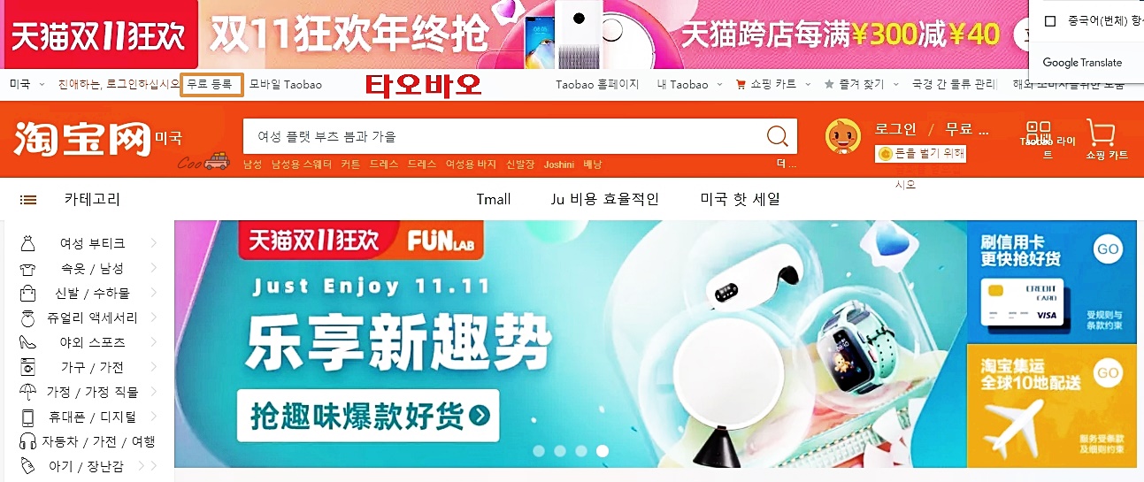 티몰, 타오바오는 웹에서 구글 번역을 돌려 카테고리,간단한 상품 정보 정도는 한글로 변환해 쇼핑을 할 수 있으나 로그인이나 회원가입 시에는 중국어로 된 화면만 나오네요. 알리익스프레스는 이메일주소나 SNS로 가입이 가능하나, 타오바오와 티몰은 폰번호를 인증 하라는 창이 뜹니다. 홈페이지가 중국어로 되어 있어 여러 가지 번거로우신 분은 샵백 같은 쇼핑직구 사이트를 이용하시면 더 편합니다.