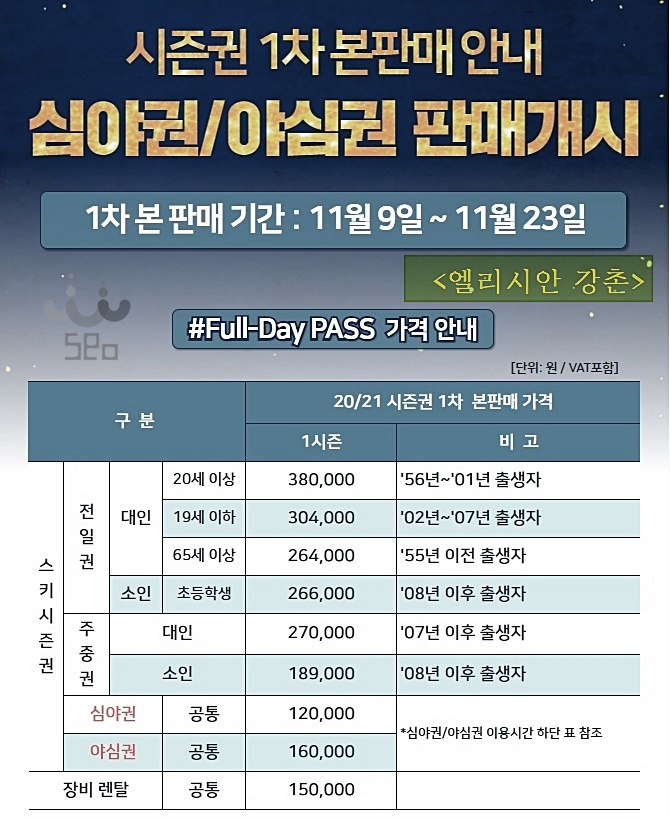 엘리시안 강촌 11월말/12월초 예상 (시즌권 본판1차 판매기간 11/9-11/23)