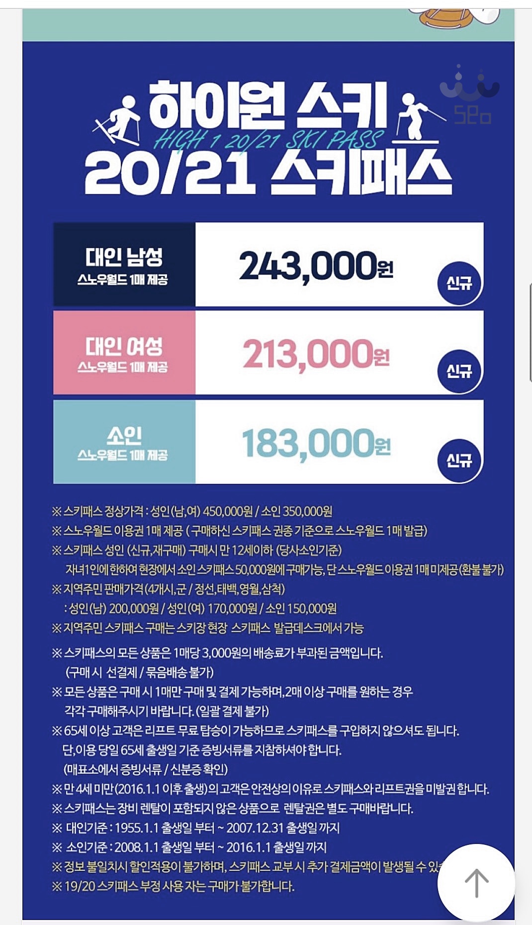 시즌권 구매시 장비렌탈 50%할인권을 준다고 하네요. 개장일날 모바일 발송하며 1매에 4인까지 할인 적용됩니다. 직영 식당 10%할인, 스키 락커 할인 30%, 스노우월드 이용권 1매를 제공하며 스노우월드 50%할인권도 모바일로 발송됩니다.(분할사용은 불가)