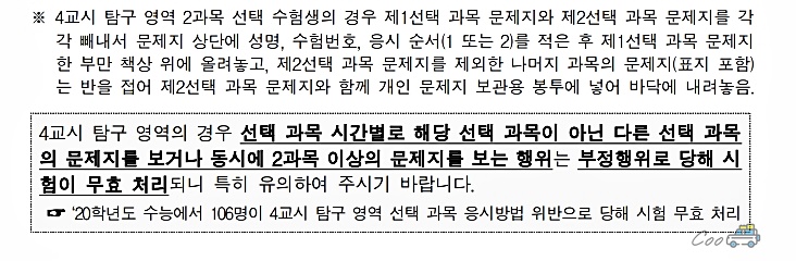 제1선택 과목을 먼저 푸는 경우 제2선택 과목은 배부받은 문제지 보관용 봉투에 넣어 바닥에 내려놓습니다. 시간별로 선택과목이 아닌 문제지를 푸는 경우 혹은 2과목 이상의 문제지를 보는 경우 부정행위로 간주하게 됩니다.(2020년도 수능에서 106명이 무효처리 되었다고 하니 유의하시기 바랍니다.)