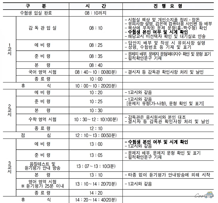 시험지는 짝수형과 홀수형 두 가지의 문형으로 구분되기 때문에 문제지를 반드시 확인하시고 푸셔야 합니다. 수험번호 끝자리가 짝수면 짝수형, 홀수면 홀수형을 배부받게 됩니다. 2교시의 경우 가형/나형도 구분이 되기 때문에 꼭 확인해주세요. 3교시는 듣기평가방송이 먼저 실시됩니다. 표지를 넘기라는 안내방송 전까지는 표지를 넘기지 말아야 합니다.