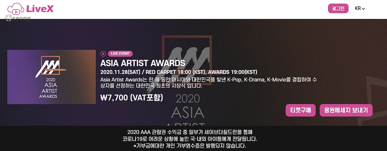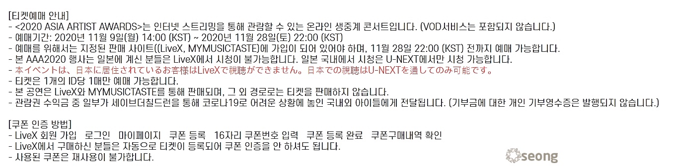 11월 28일 토요일 오후 7시에 방송이 된다고 합니다. 팬들을 현장에서 만날 수 없는 상황으로 인해 지연 방송으로 이루어지며, LiveX 와 마이 뮤직 테이스트에서 방송을 관람할 수 있다고 하네요.