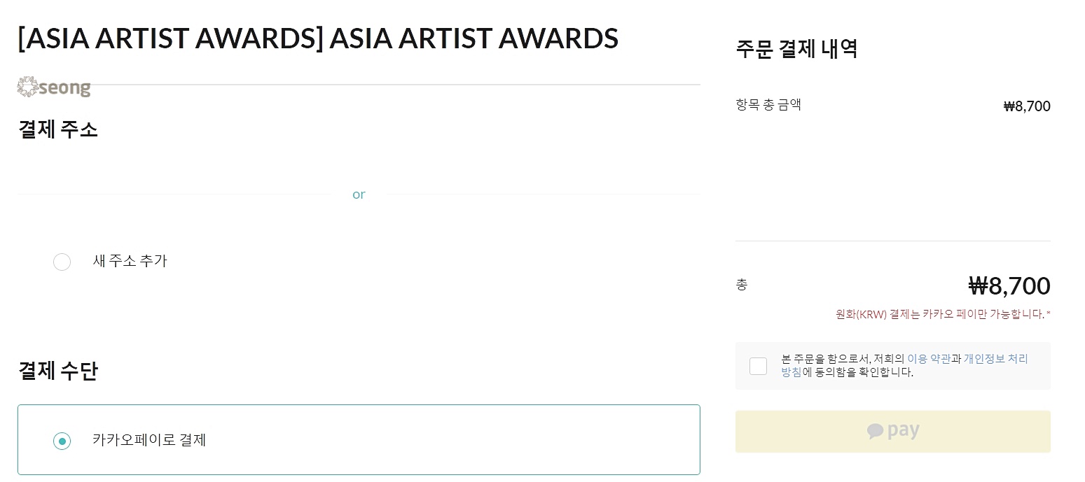 마이 뮤직 테이스트는 유저가 250만명이나 되는 공연 플랫폼인데요, 티켓 구매 후 Live 탭에서 별도 등록 없이 2020 AAA 시청을 할 수 있습니다. 티켓 구매 방법은 로그인 후 응원하고자 하는 아티스트를 선택한 후 '카카오페이' 로 결제를 완료해주시면 됩니다.(구매를 하기 전, 계정 설정을 완료하라는 창이 떠서 이메일 주소 인증을 받고 구매를 진행했습니다.)