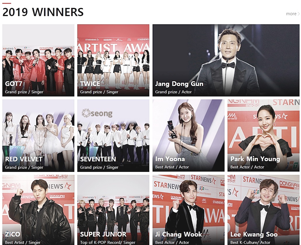 2019년도에는 배우 장동건, GOT7, 레드벨벳, 트와이스, 세븐틴이 대상을 수상했고, 베스트 액터 : 지창욱, 베스트 아티스트 : 임윤아, 박민영, 지코, 베스트 케이컬쳐 : 이광수, 갓세븐, 탑 오브 케이팝 레코드 : 슈퍼주니어, 베스트 이모티브 : 임지연, 강다니엘, 베스트 아이콘 : 최시원, 정해인, 세븐틴, 청하, 베스트 소셜 아티스트 : 임윤아, 세븐틴, 트와이스.