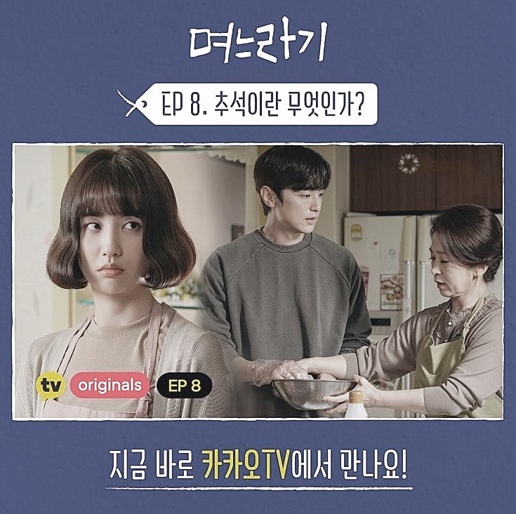 카카오tv 에서 1월 9일에 며느라기 8화가 공개되었는데요. 추석이란 무엇인가?라는 주제로 에피소드가 펼쳐졌습니다. 깨기 싫지만 시어머니의 칼질 소리에 눈을 뜬 사린이. 구영이를 깨워보지만 구영이는 꿈쩍도 하지 않습니다.