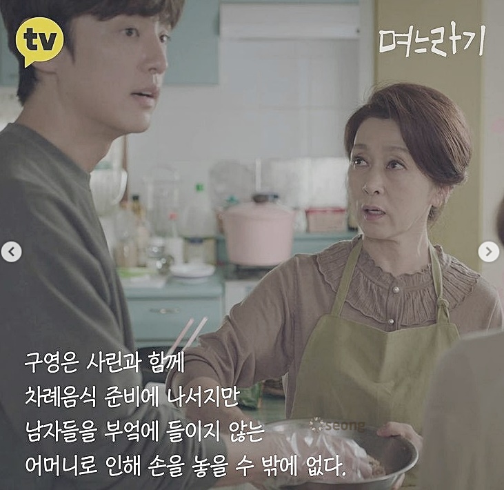 미영네 부부가 먹을 주전부리를 준비하고, 구영이는 엄마에게 이만 가보겠다고 말합니다. 왜 벌써가냐며 이럴거면 처가 먼저 다녀오라는 시어머니의 말에 사린이는 살짝 화색이 돌지만, 그 뒤에 온 말에 더 기가 막힙니다.