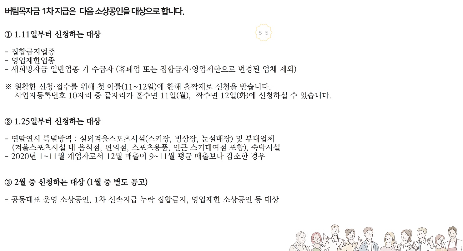 신속 지급대상 업종만 1월 11일부터 지급이 되고, 그 외 소상공인 분들은 1월 25일 이후부터 접수를 받습니다. (지자체가 추가 행정명령 내린 업종 및 연말특별방역 대상업종 등) 신속 지급 대상은 행정정보 상으로 영업제한과 집합금지를 받은 업종과 2차 새희망 자금을 수급했던 사업자 분들입니다.