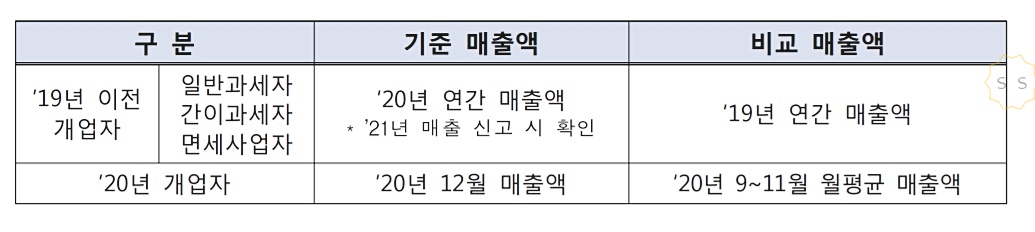 2019년 이전 개업을 한 곳은 2020년 연간 매출액 4억원 이하와 2019년도 연간매출액 대비 2020년 연간매출액이 감소하는 조건을 충족하면 되는데요.