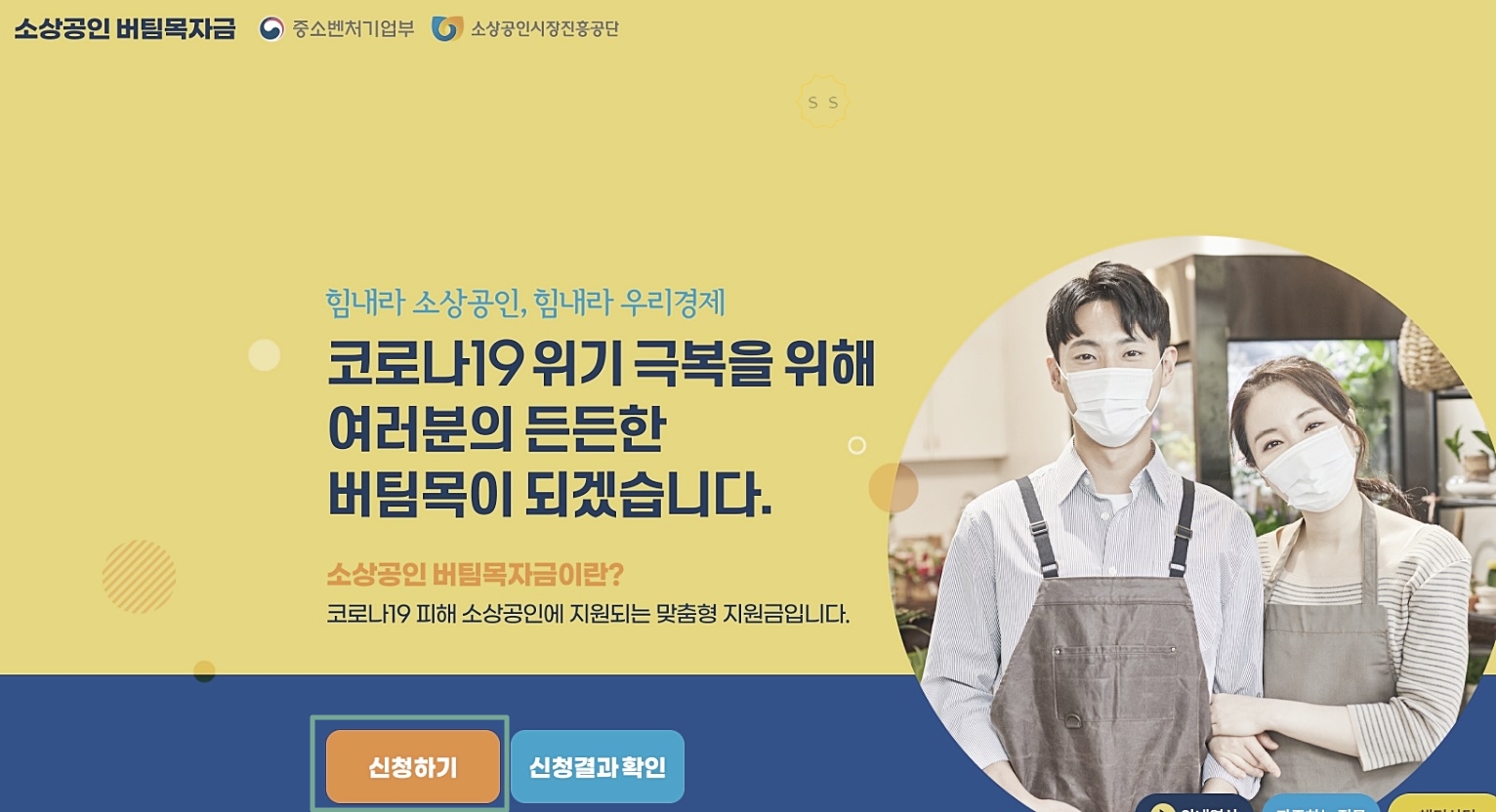 1. 소상공인 버팀목자금 홈페이지로 들어가시면, '신청하기' 버튼이 있습니다.