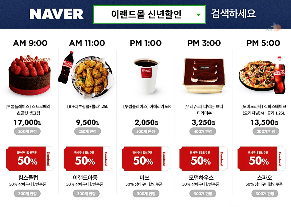 20일 오전 9시-오후 5시까지 2시간에 한 번 선착순 득템 물건으로 케이크, 치킨, 커피, 피자 등 인기 먹거리 쿠폰을 제공하며, 반값 쿠폰으로는 미쏘, 킴스 클럽, 모던하우스 등 인기 브랜드의 50% 할인쿠폰을 제공합니다. 상세한 내용은 아래와 같습니다.