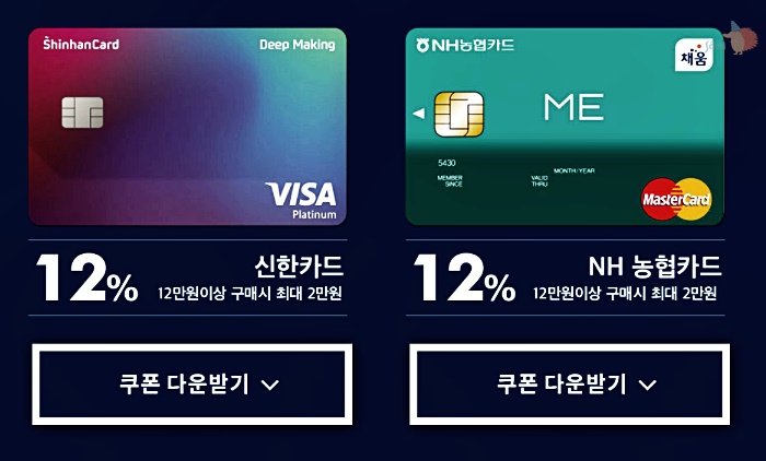 7만원이상 구매시에 최대 2만원까지 추가 할인을 받으실 수 있는데요. 카카오페이 와 KB국민카드, 신한카드, NH농협카드 만 해당됩니다. 카드사 12% 추가 할인 쿠폰은 이랜드몰 이벤트 홈페이지에서 다운받으실 수 있습니다.
