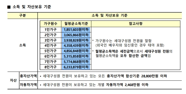 전년도 도시근로자 가구단위로 월평균소득의 70% 이하이게 되면 입주가 가능합니다. 3인 소득기준을 보자면 월평균소득 3,938,828원 이하인지 보게됩니다. 1인가구는 1,851,603원 이하, 2인가구 3,065,866원 이하, 4인가구 4,358,439원 이하, 5인가구 4,856,848원 이하입니다. 임산부가 있는 경우 뱃속 태아까지 세대원에 포함해 계산해주시면 됩니다. (소득기준 70%이하면 신청가능하나 평균소득 50%이하인 사람들에게 우선적으로 공급합니다.)