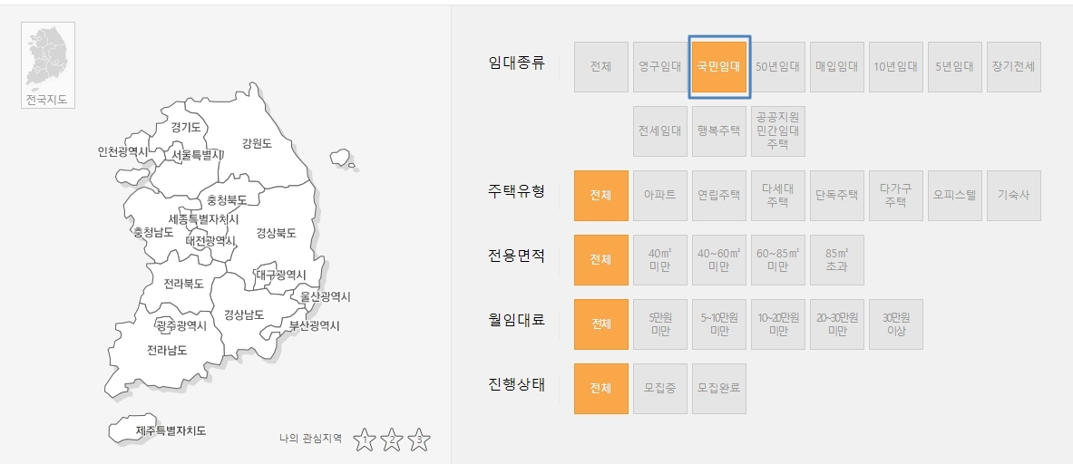 마이홈포털에 접속하시면 국민임대아파트 공고가 떠있습니다. '공공주택찾기-임대주택찾기-입주자모집공고'로 들어가시면 임대 종류를 선택하고 공고 검색이 가능합니다. 각 지역별로 입주자 모집을 하는 공고들이 쭉 뜹니다.